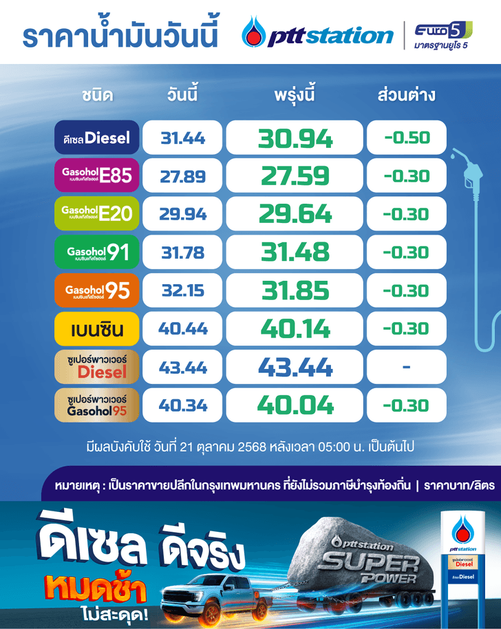 ราคาน้ำมันวันนี้ 21 ตุลาคม 2568 (มีผลเวลา 05.00 น.)
